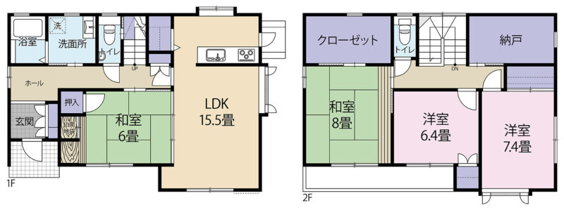 | 間取内容 | LDK15.5畳 洋室6.4畳 洋室7.4畳 和室6畳 和室8畳 | ||